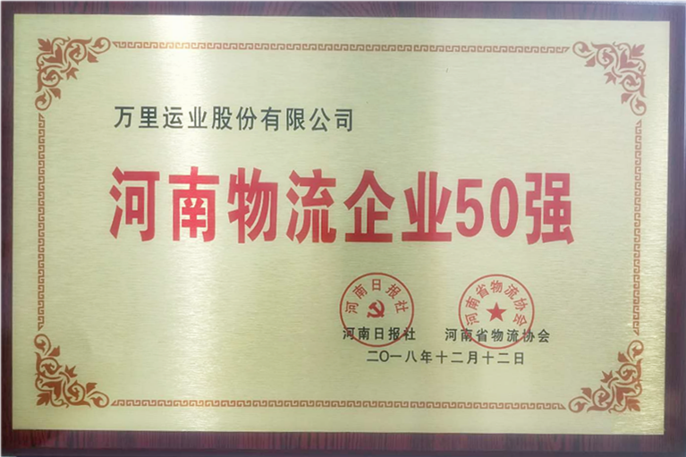 2018年12月29日,2018河南省物流企业家年会暨河南物流企业50强颁奖典礼在郑州举办。河南省物流协会会长谭荣铸,河南日报报业集团党委委员、副总编辑肖建中,国家发改委综合运输研究所研究员张国强,河南省商务厅投资促进局局长徐大群,中国电信特聘物流信息化专家陈永晖,河南省道路运输管理局张佳佳等嘉宾和全省物流行业骨干企业负责人300余人参加了本次大会。万里运业股份有限公司获得河南省物流协会颁发的“河南物流企业50强”的荣誉称号。