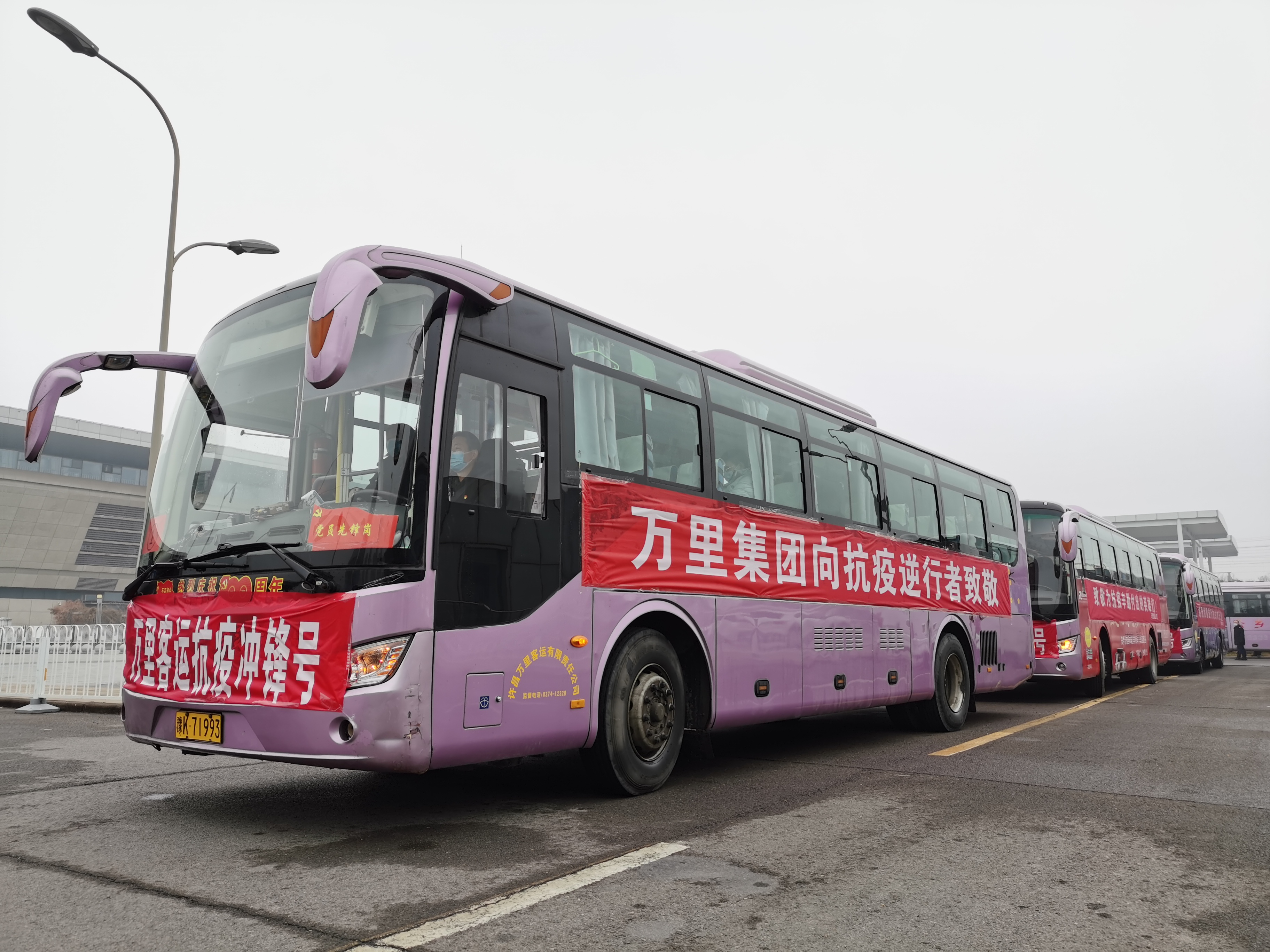 1月13日,接上级部门指示,由市交通运输局党组书记、局长李晓文、市道路运输服务中心主任刘晓杰,万里运业董事长陈宇飞、总经理王柏强、客运副总孔辉、万里校车总经理李国力现场协调指挥调度11台校车和9台大巴车支援禹州,公司部分中、高层管理人员齐上阵分发防疫物资,确认出车信息。一声令下,集结队伍再出发!