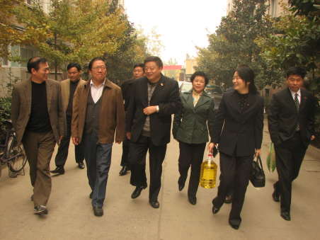 市人大常委会副主任、市总工会主席刘海川(前左二)、市交通局局长常岱军(前左一)、万里集团党委书记、董事长陈立友(前左三)、万里集团党委副书记、工会主席刘虹(右二)、万里集团副总经理程新民(右一)带着大米、食用油、水果等看望慰问万里集团的困难职工。