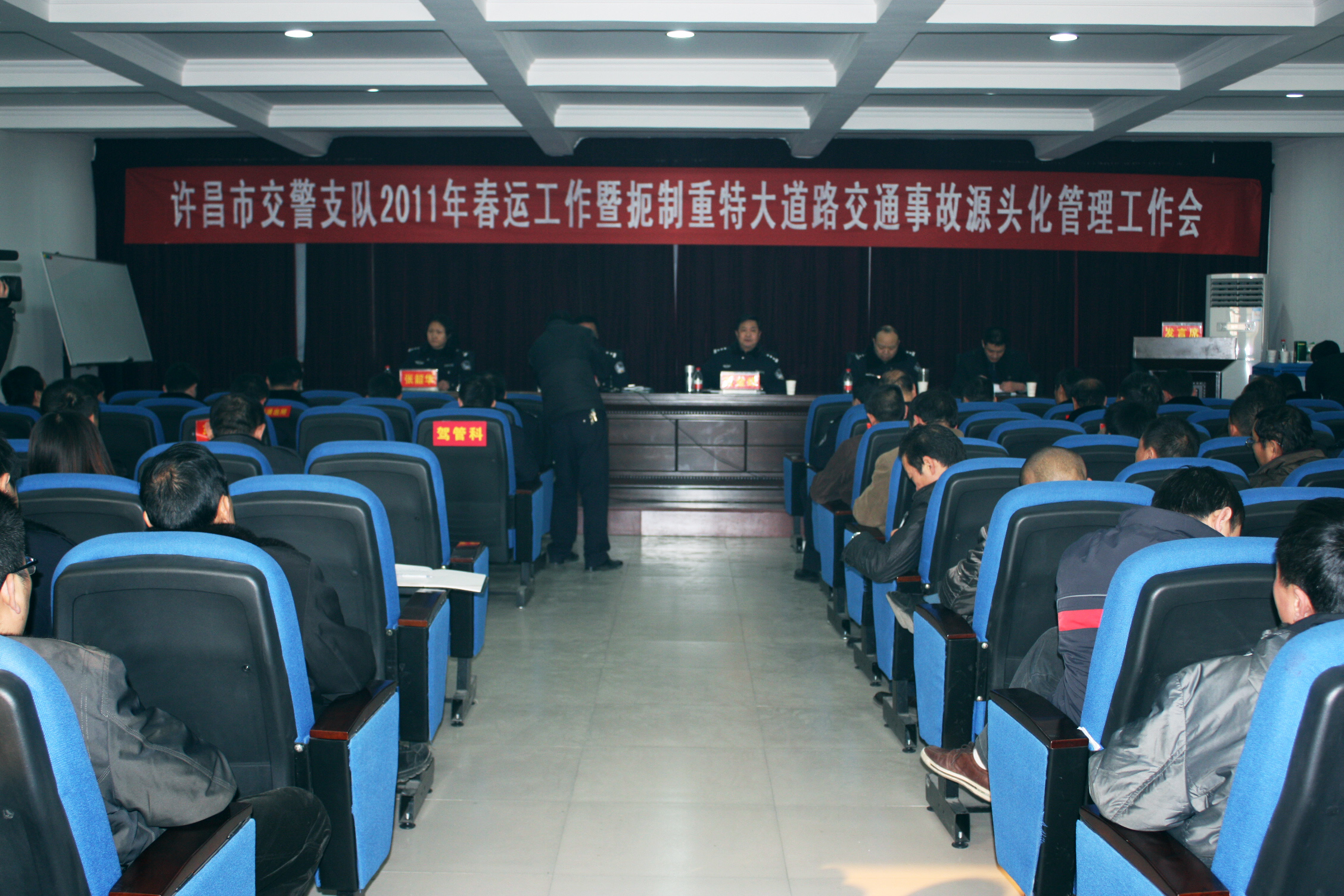 2011年1月17日下午,“许昌市2011年春运工作暨遏制重、特大道路交通事故车辆源头化管理工作会”在万里物流园召开。全市各主要客运场站、出租、公交等客运单位及各派出所负责人100余人参加会议。市交警支队支队长黄金峰、副支队长胡广斌、席宏禹等出席会议。会议通报了平顶山“1.11”特大交通事故的情况,并对2011年春运工作和进一步加强车辆源头化管理工作提出具体要求。