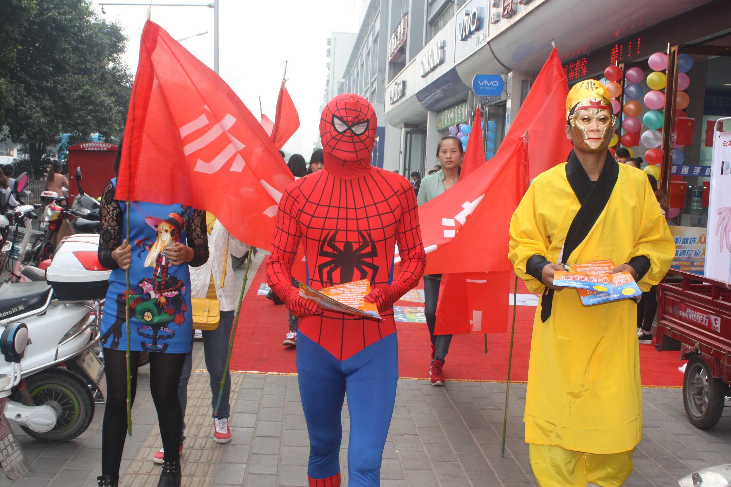 10月18日上午,很多家长像往常一样带着孩子在文峰广场上玩耍,突然有几个小孩在尖叫:快看——蜘蛛侠!啊,还有孙悟空!这时候最早看到的小朋友跑了过来:“叔叔,你们真酷,你们是做什么的?”