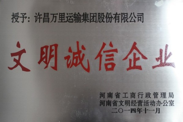 近日,河南省工商行政管理局、河南省文明经营活动办公室联合发文表彰了2014年度“文明诚信企业”,许昌万里运输集团股份有限公司名列其中,被评为2014年度“河南省文明诚信企业”。