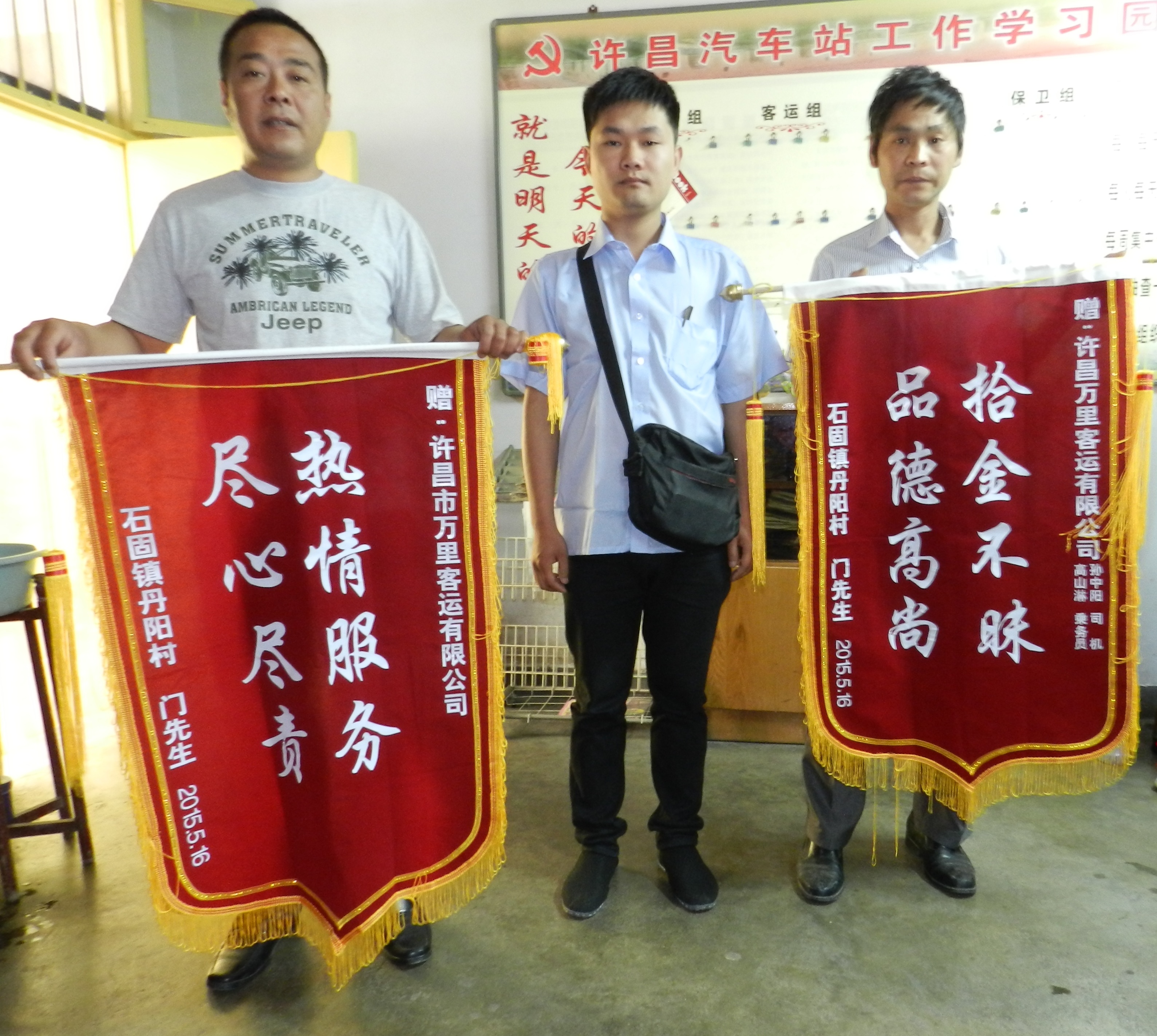 5月10日上午,富士公司许郑公交乘务员高山淋在车厢内打扫卫生时,捡到咖啡色挎包一个,随即告知同车驾驶员孙中阳,经现场查验,包内装有现金3500多元、银行卡4张、身份证一张。经过工作人员多方联系终于找到失主,失主是石固镇丹阳村门先生。门先生接过失而复得的挎包时满脸喜悦,并特意准备了锦旗以表感谢之情!