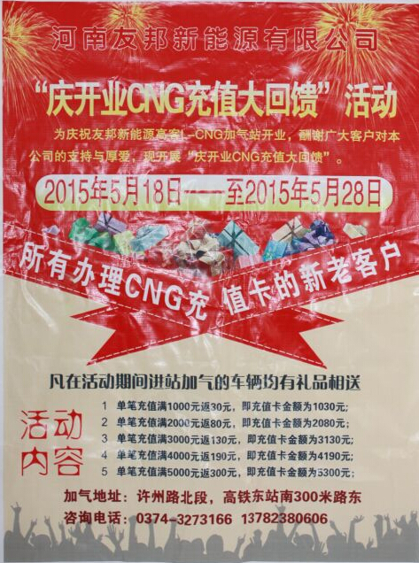 另外,为庆祝开业,该站于5月18日——28日开展“庆开业CNG充值大回馈”活动,在后续经营中,还将陆续推出其他优惠活动,回馈广大新老客户。