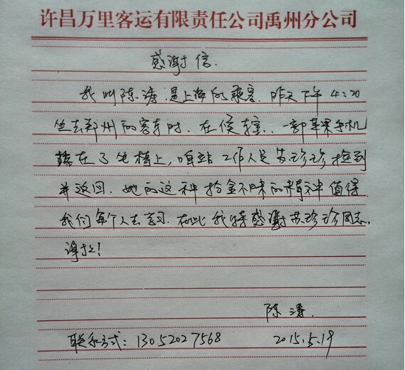 我叫陈涛,是一名来自上海的乘客。5月18日下午4:20在禹州汽车站乘坐前往郑州的客车。在候车室候车时,不慎将一部苹果手机落在了座椅上。贵站工作人员苏珍珍捡到后立即多方寻找失主并及时给予返回,他的这种拾金不昧的精神值得我们每个人去学习,在此我衷心的感谢苏珍珍同志!