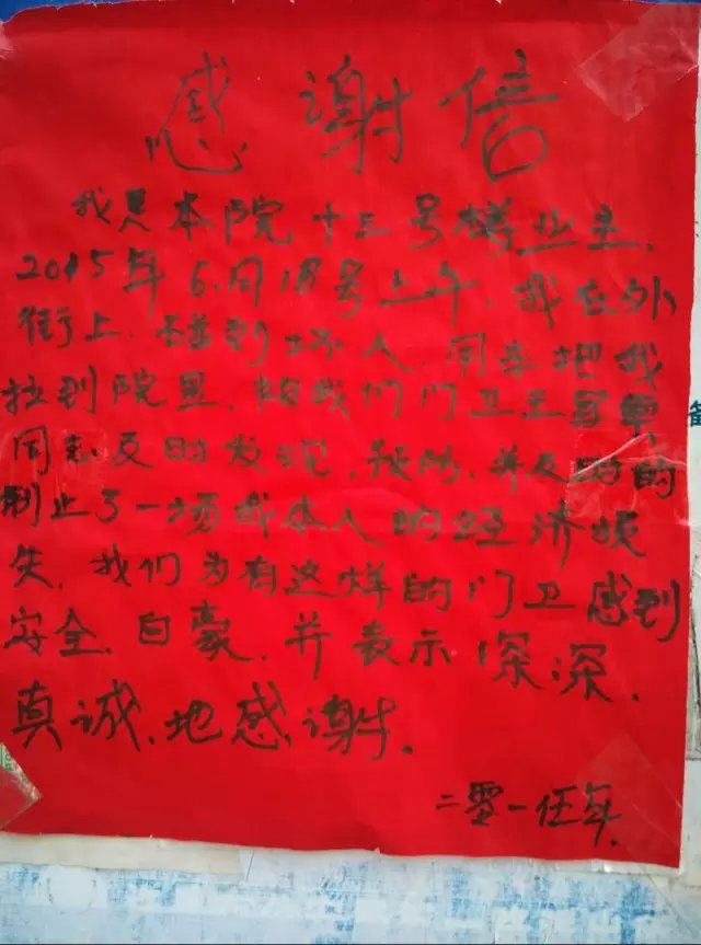 简短朴实的话语寄托着张大爷及业主对门卫王军霞由衷的感激之情,鲜红的感谢信也将激励我们物业公司继续以饱满的工作热情投入到工作中去,为保小区一方平安做出自己的努力。
