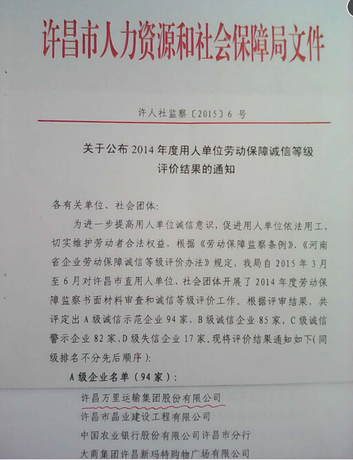7月8日,许昌市人力资源和社会保障局对市直用人单位、社会团体共计278家单位开展的2014年度劳动保障监察书面材料审查和诚信等级评价中,许昌万里运输集团股份有限公司被评为“A级诚信示范企业”。