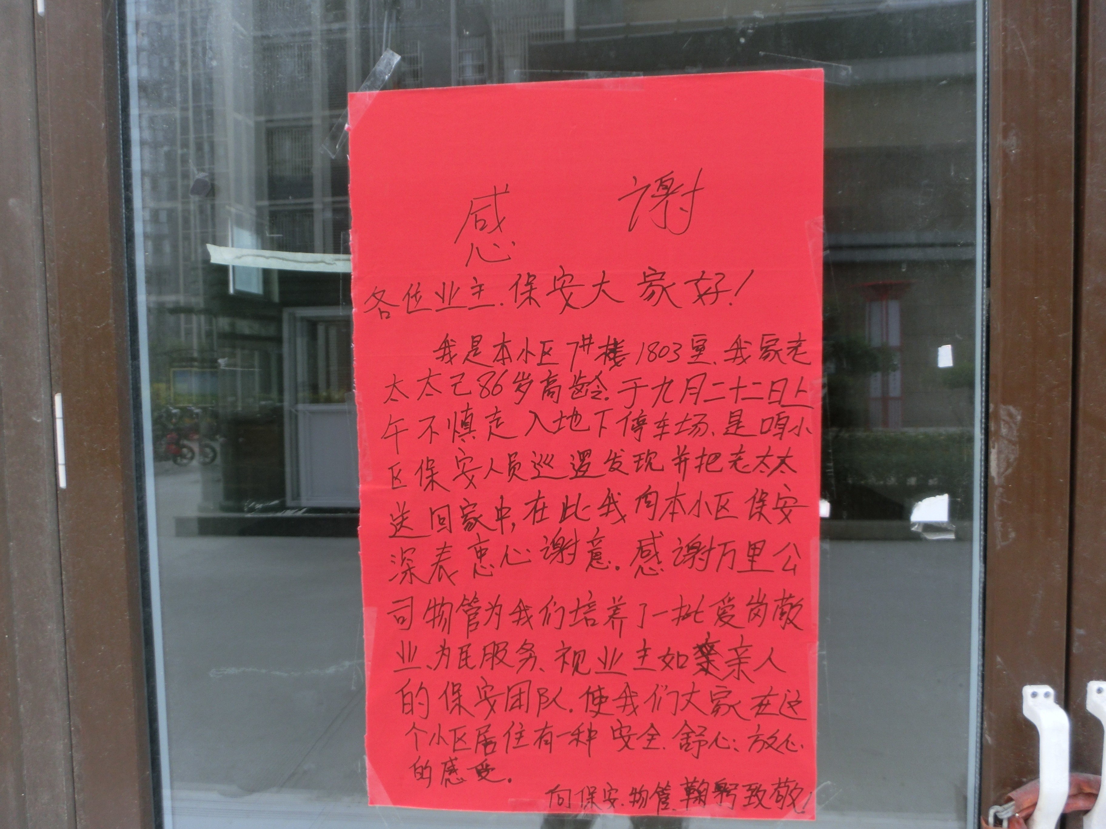 2015年9月25日上午,万里物业珑绣花园服务中心收到了一张红彤彤的感谢信,这是7号楼1803室业主齐先生亲自送来的一份感谢信,目的是为感谢保安人员把在地下停车场迷路的86岁老母亲送回家而写的感谢信。