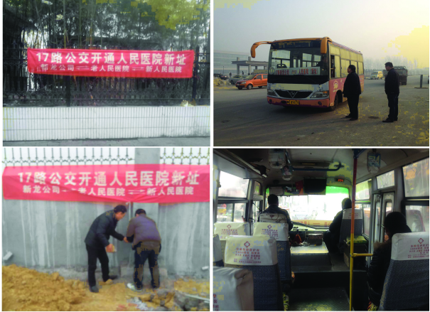 为了配合禹州市人民医院搬迁,按照禹州市人民政府和上级主管部门的安排,需要开通禹州市人民医院-禹州市人民医院新址的临时班线,由于批示的搬迁线路偏僻,车辆载客率低,车辆都不愿前往。面对这个棘手问题,万里禹州分公司经理王建安亲自协调,和禹通公交公司赵玉峰主任一起做通17路线路的工作。并指示禹通公交制作线路牌,宣传横幅,还对空驶车辆给予一定的补助,使临时班线按时开通并按要求顺利运营。