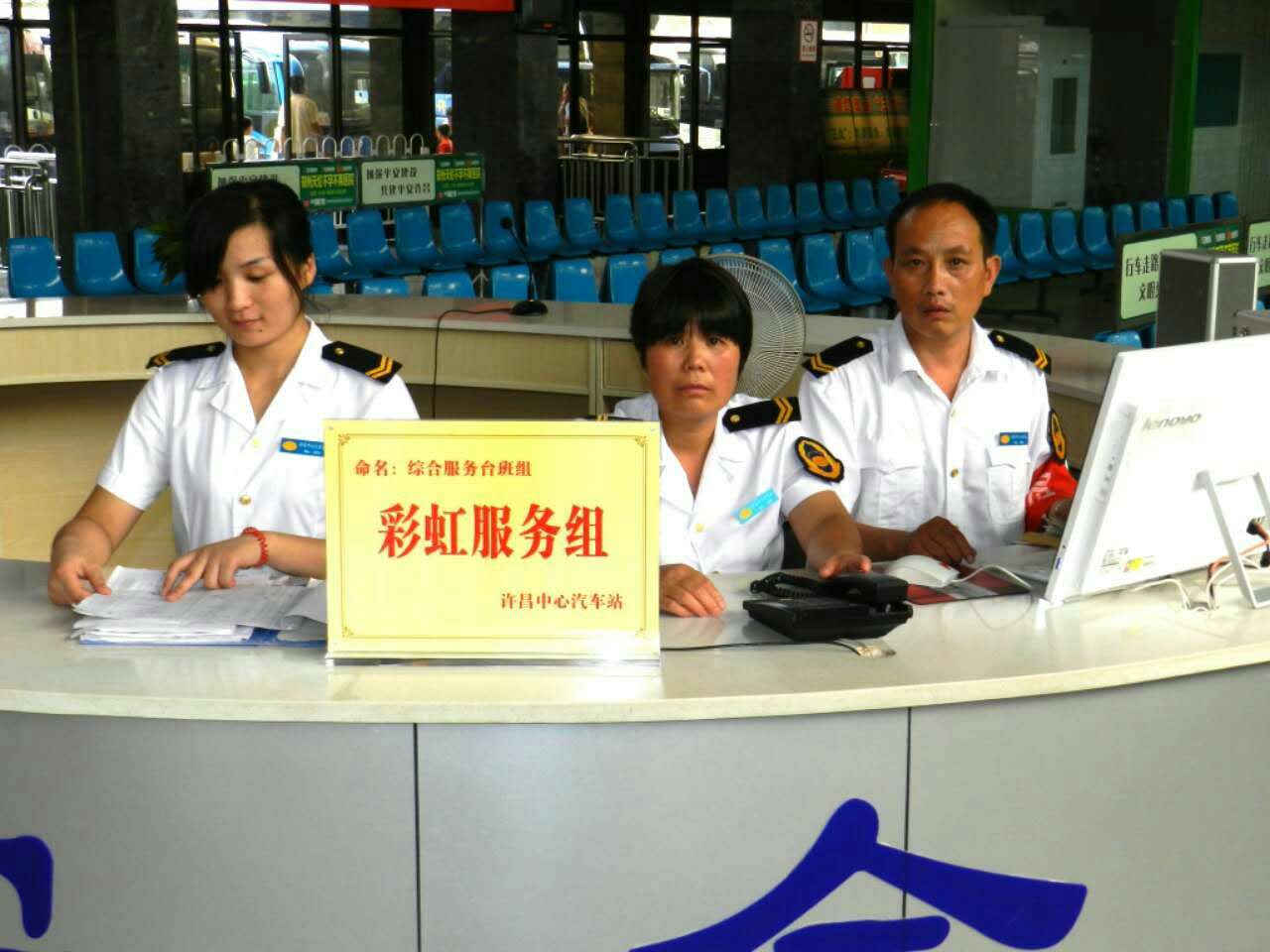 许昌中心汽车站,为了强化全体站务人员的服务意识,实现服务与经济同步提高。抓典型、树标杆。8月1日,在二楼会议室召开表彰大会,命名综合服务台班组为“彩虹服务组”。综合服务台班组成员:黎丹、肖矿伟、赵慧敏为“服务明星”,站长陈鹏波给获奖者颁发了“奖品”。