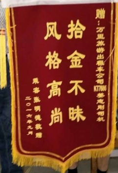 9月13日上午,乘客张先生捧着写有“拾金不昧,风格高尚”的锦旗来到了万里旅游出租车公司,感谢豫KT-7686出租车驾驶员姜志刚师傅。