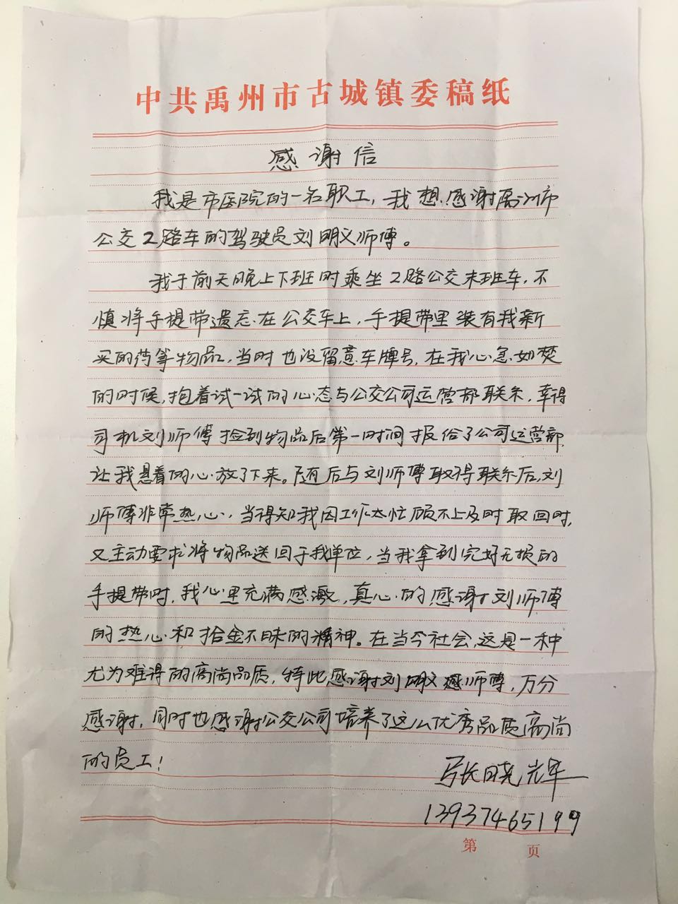 张先生接过手提袋,一个劲的说谢谢。事后,又再次向禹州市公共交通有限公司送来感谢信,再次对刘车长拾金不昧、助人为乐的精神表示感谢。