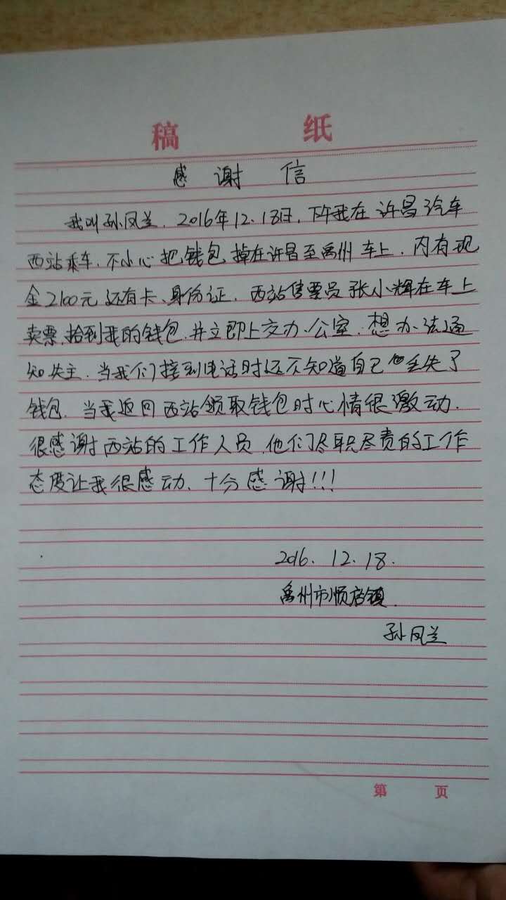一个小时之后失主来到西站,失主是孙女士,她接过失而复得的钱包后,挥笔写下了感谢信:“西站工作人员尽职尽责的工作态度让我十分感动,以后我会经常乘坐许禹快巴。”对待旅客,我们只有付出真心、付出亲情,才能打动旅客;只有延伸我们的服务,才能争取更多的回头客。服务无止境!