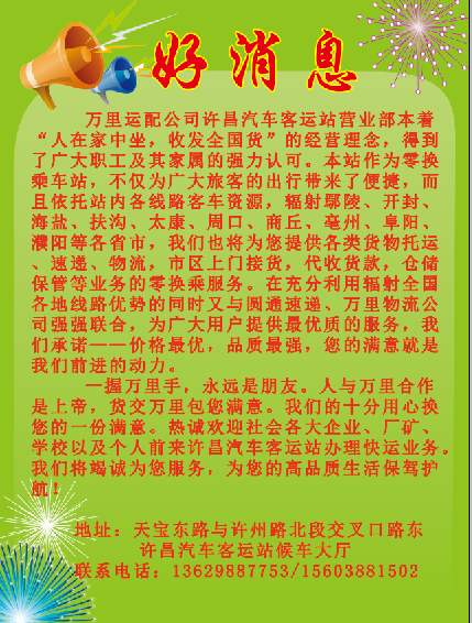 运配一体化增收创效的序幕已经拉开。我们要在思想上认识到万里客运的优势,发挥万里客运的优势,万里客运的优势是什么? 我们认为主要包括:1、万里客运是许昌最大的客运企业,品牌好。2、咱是河南第一家上市企业,实力强。3、道条已改,允许以客带货,实现人坐不满咱带货,车增收,站得利,公司得效益最佳之机。4、开客车的驾驶员,车辆安全技术好。5、以人为本,客车安全状况好。6、员工热情好客,文明礼貌,待人接物素质高。7、上门接送,随车而走,货物比物流公司快的多。8、随行就市,价格面议,关键就在服务态度好,人与万里合作是上帝,货交万里安全、方便、快捷、高效又满意,按照网格化发展区域,站包片,车联线,人包点,事业成败关键在人,人是核心,以人为本。在新的一年即将到来之际,我们在思想上,要更加重视,在提升认识上要不断下功夫,在发动全体员工,要一传十,十传百,口口相传,在星星之火可以燎原的中国特色人脉关系上,趟出一条以客带货特色发展服务之路。