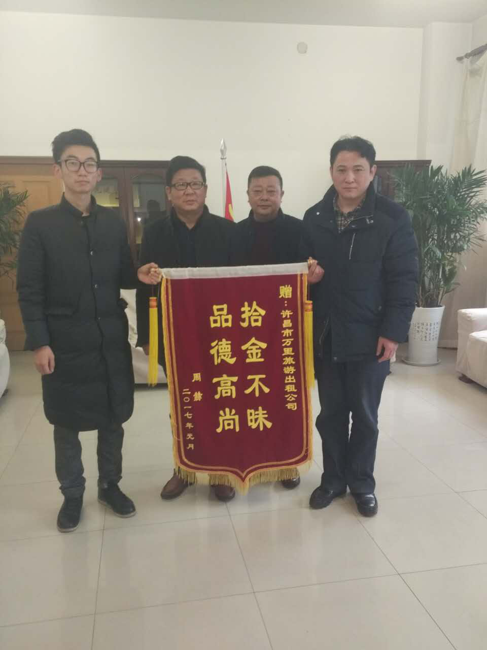 2017年元月7日晚上,市民周先生乘坐旅游出租车公司9235号车回家,不慎将随身携带的价值2万余元的贝斯琴遗忘在车上。因他没有留意车牌号,焦急的他便抱着试试的心态与我市公交处和各家出租车公司联系寻找。出租车公司得知消息后,立即在微信群、办公飞信和寻物QQ群帮助寻找。元月8日上午,出租车公司9235号车驾驶员郭建立师傅向公司上报捡到了一个贝斯琴,正在寻找失主。出租车公司通过多种渠道与周先生取得联系,并于元月9日上午 ,将贝斯琴归还于失主周先生,周先生接过失而复得的贝斯琴,一个劲的说“谢谢”。并于元月10日向旅游出租车公司送来锦旗一面,再次对郭建立师傅拾金不昧、品德高尚的精神表示了感谢。