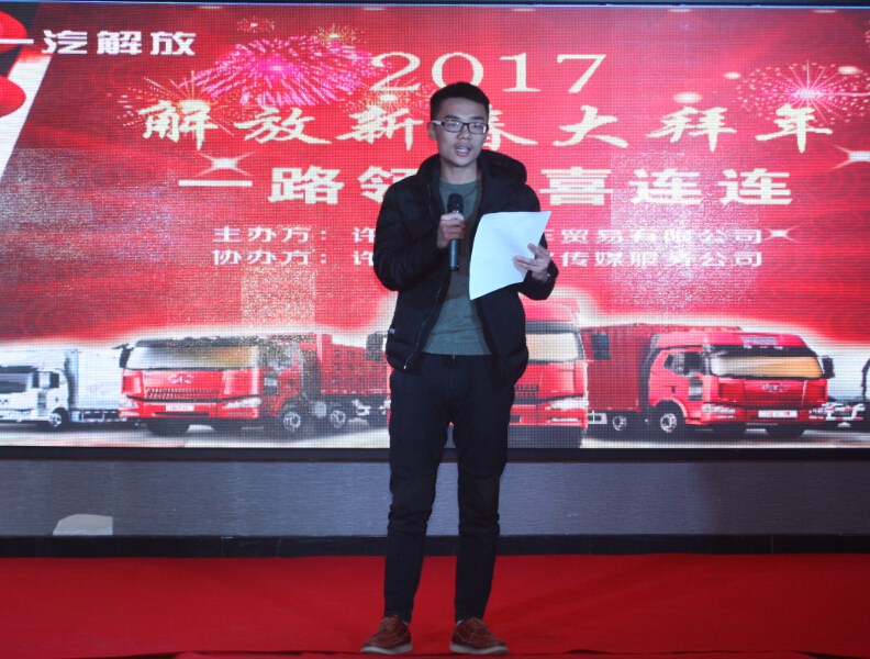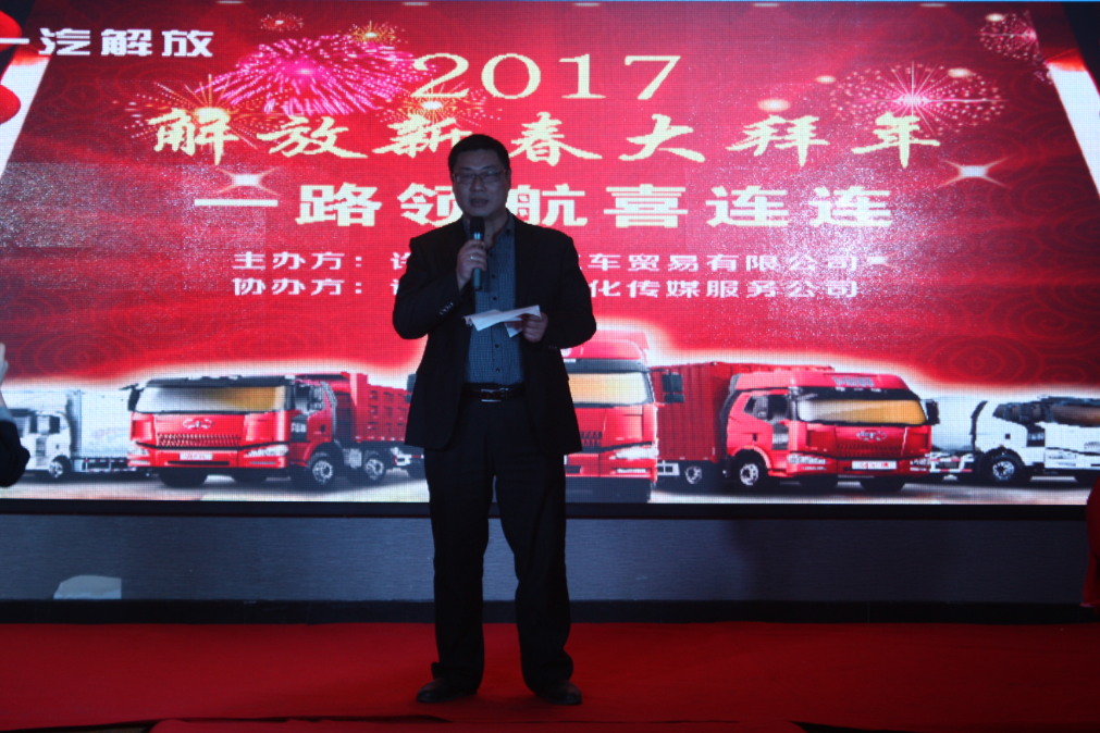 许昌万里汽车贸易有限公司总经理吴松胜在大拜年活动致辞中表示:2016年,解放充分把握国家“十三五”开局的难得机遇,取得了一系列发展与成绩。2016年,解放销售业绩喜报不断,实现重卡单月销量11连冠,如此骄人成绩的取得,离不开我们广大解放用户朋友们长久以来的支持。今天,我们共聚解放大拜年的活动现场,值此新春佳节到来之际,我谨代表一汽解放全体员工对大家一如既往的支持呈上解放人最诚挚的谢意。祝愿大家在新的一年里,身体健康、阖家幸福、事业蒸蒸日上。今天在座的来宾中,有许多是解放的老朋友,也有许多是解放的新朋友,2016解放销量的一路领航离不开各位新老朋友们的大力支持与精诚合作!2017充满机遇与挑战,在这里解放希望能与大家一同披荆斩棘,再接再厉,共创佳绩!