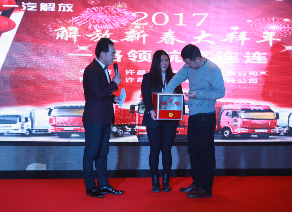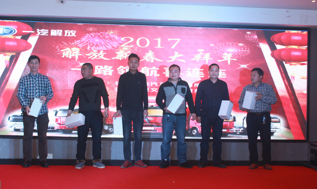 一甲子创新不止,六十载,路漫漫只为用户,造好车。领驰骋华夏大地,奔千里,航风帆匠心永恒,铸辉煌!2017一汽解放新春大拜年活动1月10日于许昌大酒店隆重举行!到场客户百余人,现场掌声不断,高潮迭起。