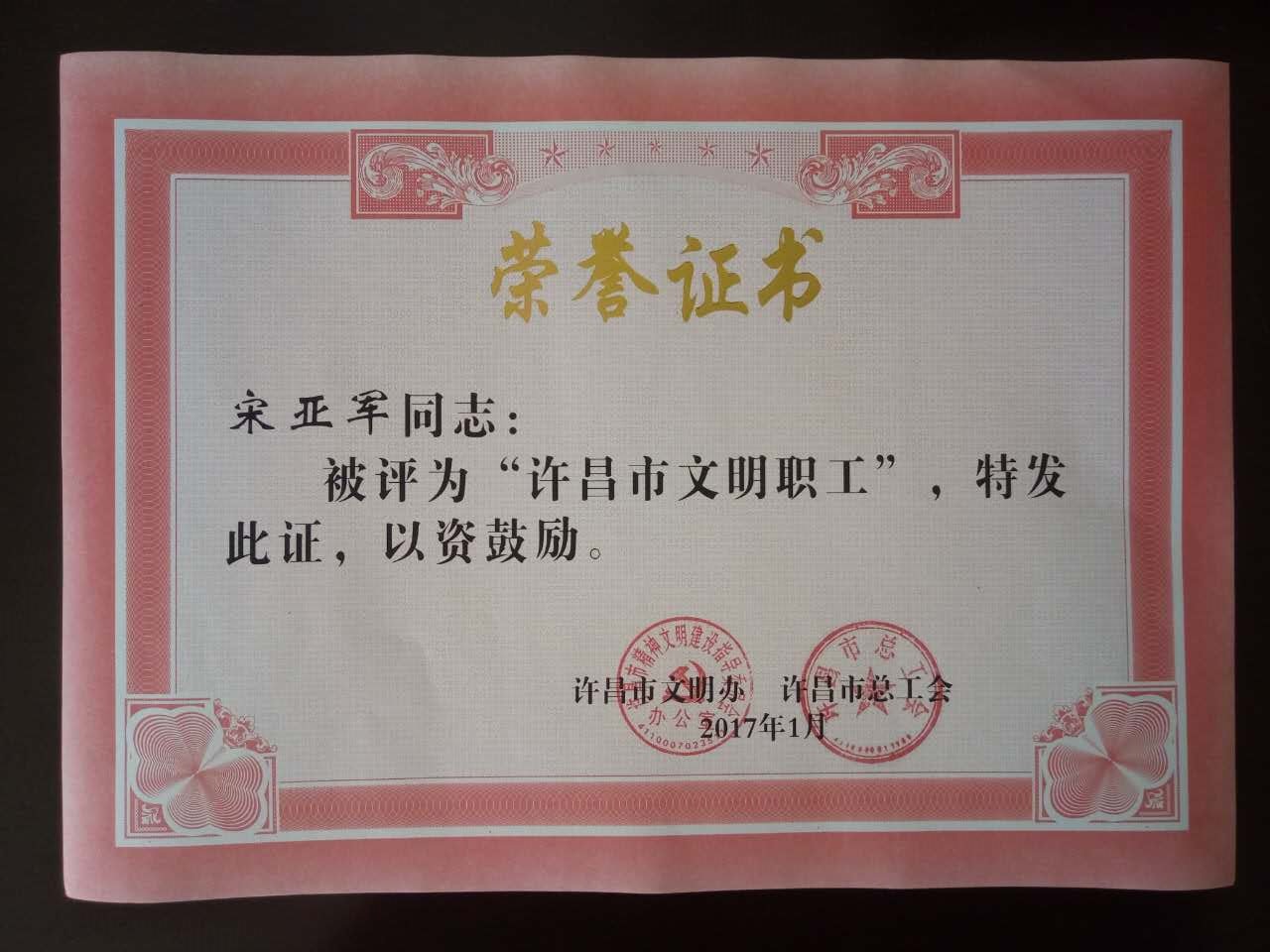 许昌汽车客运站职工宋亚军荣获“许昌市文明职工”称号