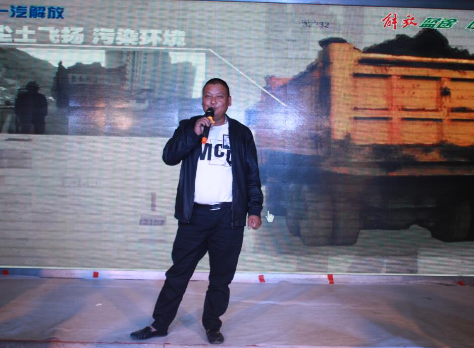 一汽解放老客户陈光耀作为客户代表在舞台上发言,他由衷的感谢一汽解放车,他说买车就是买安全,解放的品质值得我们信赖,希望广大卡友继续支持解放产品,我们都要做解放的代言人。