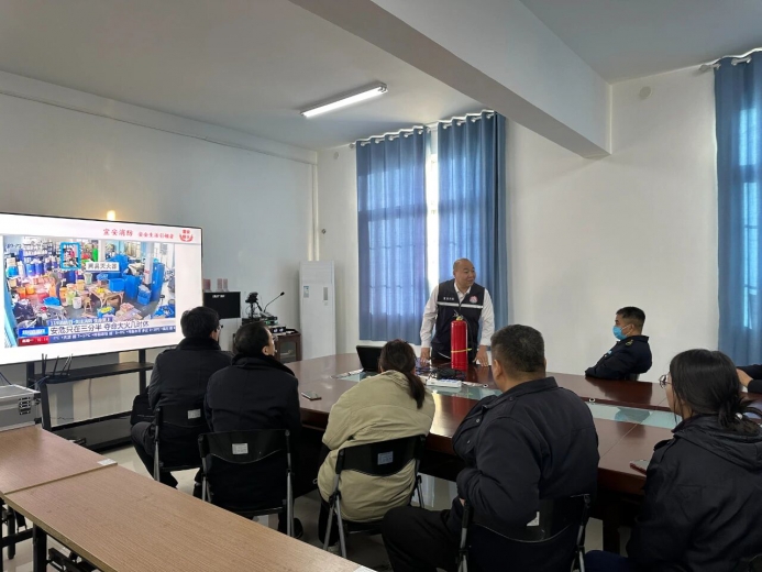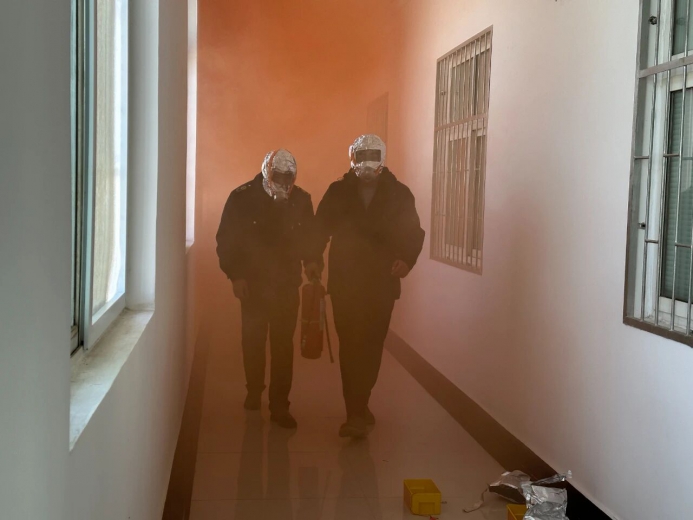 办公场所火灾疏散与初期扑救模拟办公楼会议室隔壁房间“起火”,烟雾迅速扩散,人员被困。现场员工按照办公场所失火逃生培训内容,立即切断楼层电源,组织人员捂鼻弯腰,沿疏散通道快速撤离。消防救援组快速响应,使用灭火器扑灭火源。