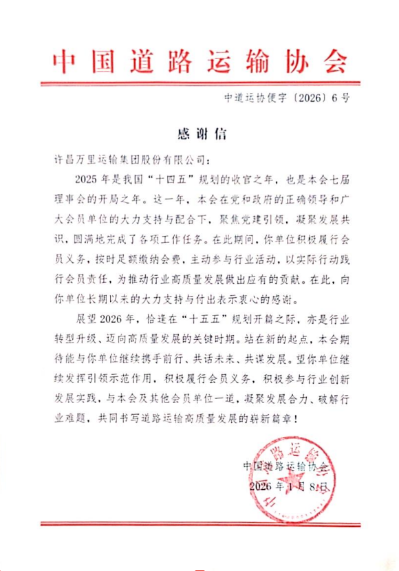 近日,许昌万里运输集团收到中国道路运输协会发来得感谢信(中道运协便字(2026)6号)。中国道路运输协会在信中,高度评价双方在行业生态、行业文化建设中紧密协同联动,充分肯定许昌万里运输集团在推动行业高质量发展中展现的专业能力与责任担当,并表示将继续深化合作。